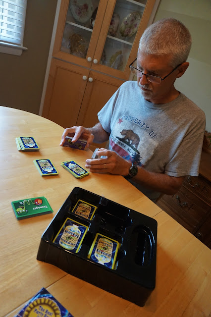 Below I've shown the cards a little closer up. In the first picture everyone is trying to sell a product to the babysitter: a "diaper book" that entertains kids long enough to keep them cooperative for a diaper change, an "island trap" that opens up into a localized tropical paradise that keeps the kids in one place, and a "pizza jacket" for the babysitter to wear so that he always has food available to get the kids happy and under control. See if you can figure out how the products might have been pitched to the kindergartner in the last picture on this post.